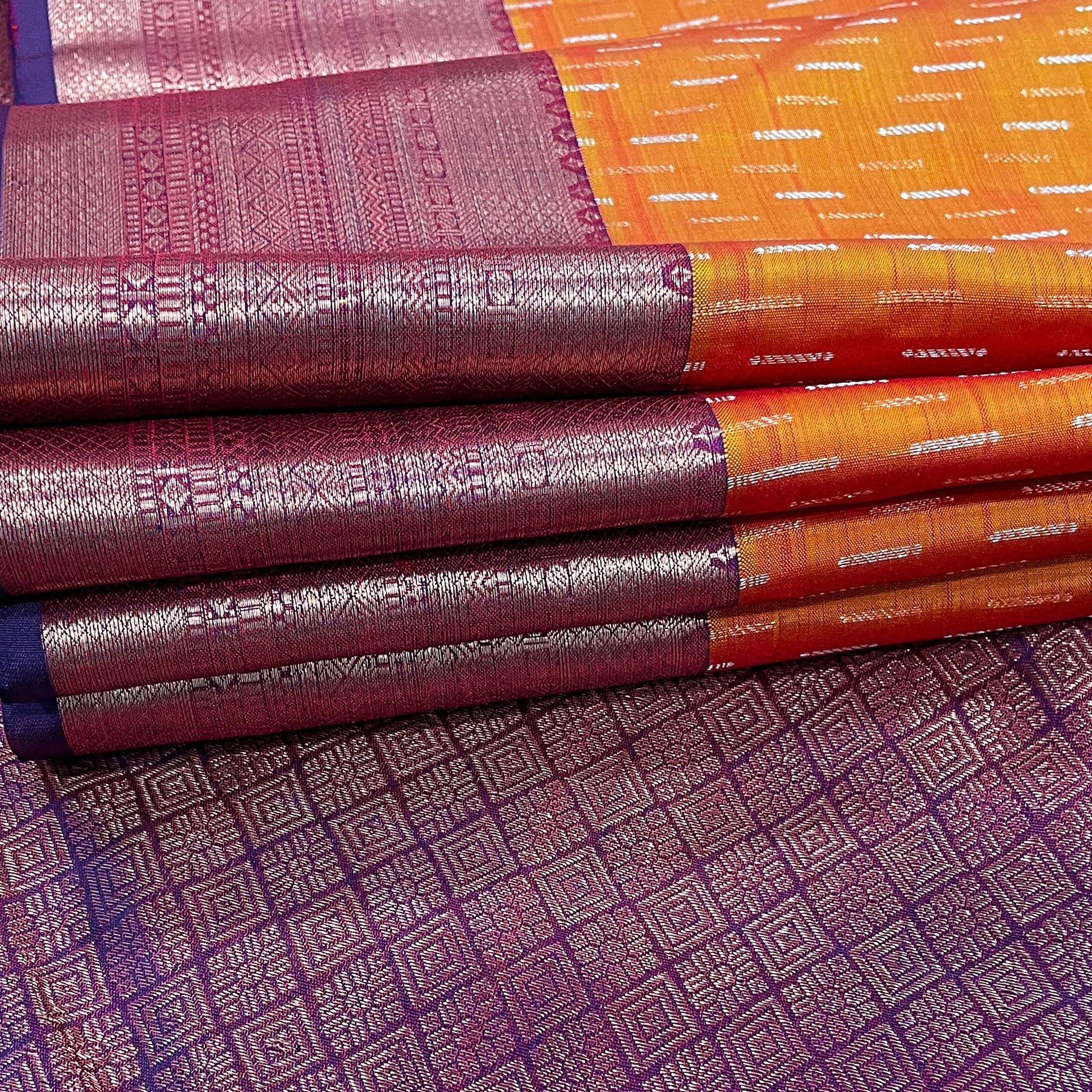 Radiate festive charm with this striking bright orange silk saree, beautifully woven with delicate golden threadwork in vertical patterns across the body. The saree is paired with a rich deep purple-red border and pallu, intricately detailed with traditional zari designs that shimmer with every fold.